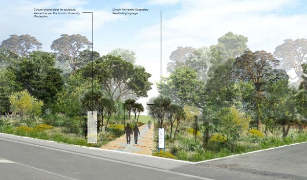 The shared pedestrian/cycle pathway provides a formal link between the University and the township and enables easy access to the town centre for the campus community, as well as reciprocal access for the wider Lincoln community to campus facilities – such as Waimarie, Te Kete Ika and Whare Hākinakina.
